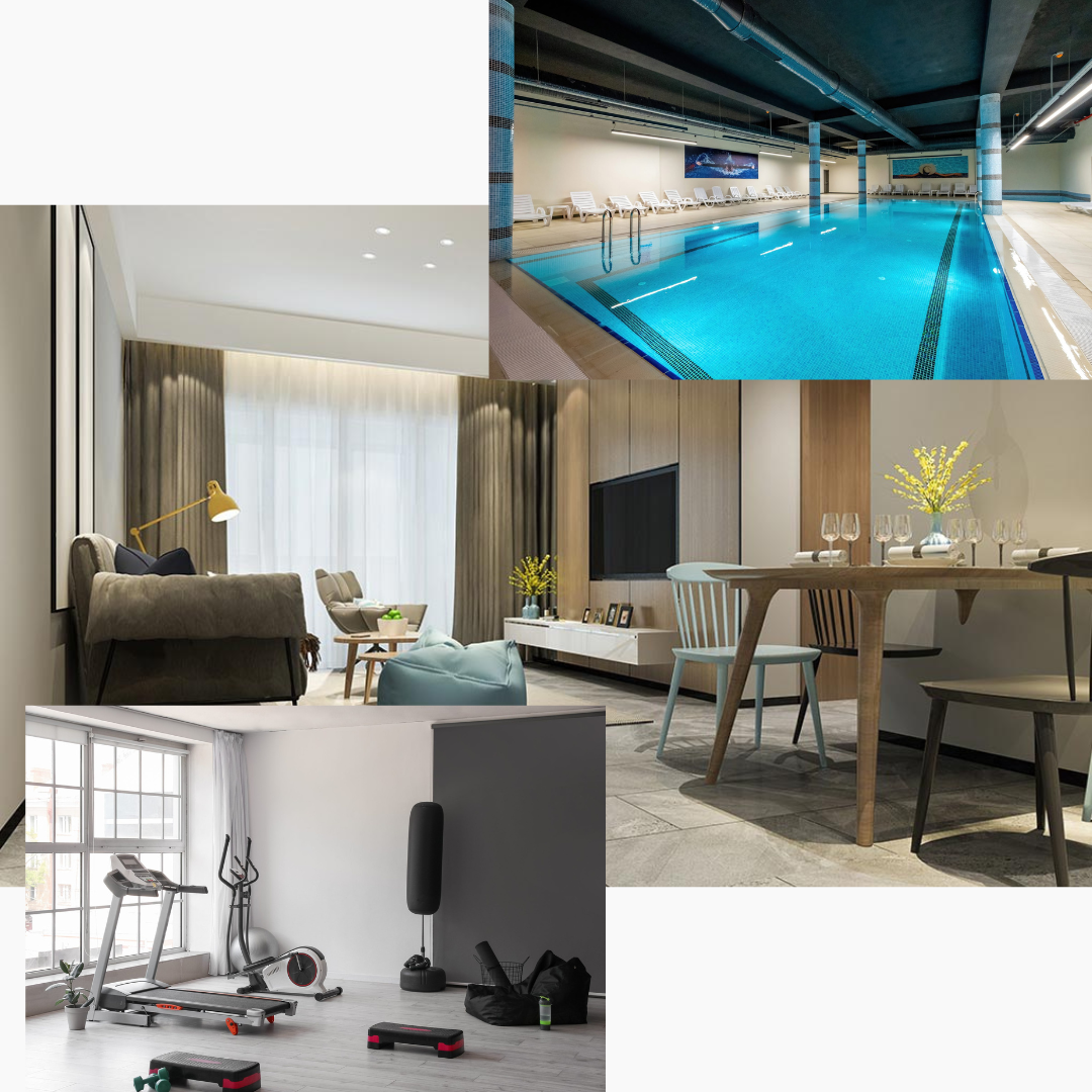 المجمع مجهز بأفضل المرافق، بما في ذلك مسابح، مصاعد، ومساحات خضراء، بالإضافة إلى مسبح مغطى في الطابق السفلي، موقف سيارات، وملعب للأطفال